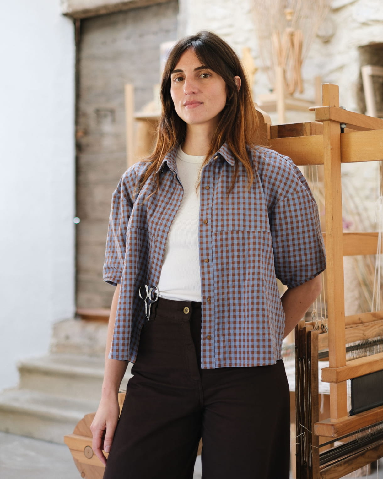 C’è un telaio in legno antico, circondato dai miei strumenti di tessitura come le navette e i rotoli di fili naturali (lino, carta, canapa, lana). Le pareti sono spesso ricoperte di progetti o ricerche in corso, campioni di tessitura e soprattutto disegni. Ho anche dedicato uno spazio al mio “laboratorio dei colori” per la preparazione degli inchiostri. Ci sono anche piante secche, una bilancia, pigmenti, recipienti e pennelli. E naturalmente qualche libro d’arte che m’ispira quotidianamente... Un libro di Etel Adnan o una guida ai colori naturali sono sempre a portata di mano.
